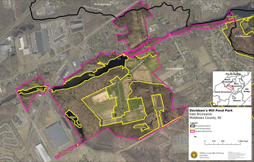 Davidson’s Mill Pond Park is a 417+ acre Middlesex County park that showcases a diverse and valuable natural landscape. The property includes grassland meadows, upland forests, open water, streams, and wetlands, along with cultivated agricultural fields managed by Rutgers Cooperative Extension and maintained lawn areas for public use.
